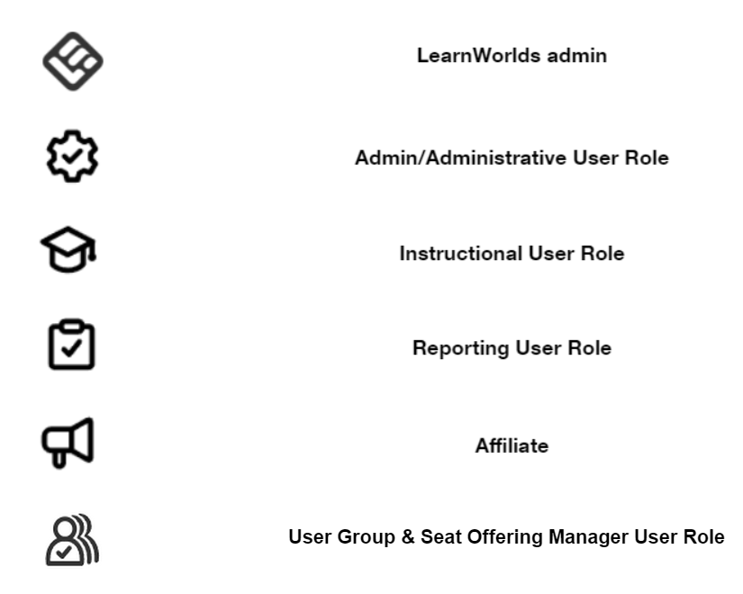 - Mỗi vai trò có thể có một số quyền nhất định đối với những gì người dùng cụ thể có thể xem và quản lý trong nền tảng LearnWorlds. Bạn có thể tìm thêm thông tin trong bài viết tương ứng của chúng tôi.