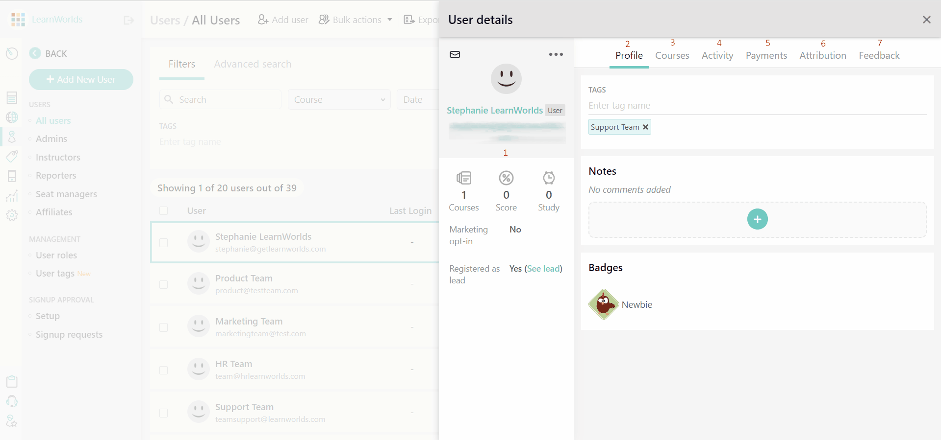 2. Trong tab Hồ sơ, bạn có thể xem thẻ người dùng và huy hiệu được trao cũng như ghi chú để giúp bạn cá nhân hóa mối quan hệ của mình với người dùng. Ghi chú chỉ hiển thị với quản trị viên vì chúng hữu ích trong việc theo dõi mọi chi tiết bạn muốn thêm cho một người dùng cụ thể, chẳng hạn như bất kỳ yêu cầu đặc biệt nào mà họ hỏi. Ngoài ra, bạn có thể xem thông tin về đăng ký của người dùng từ Stripe nếu bạn bán đăng ký.