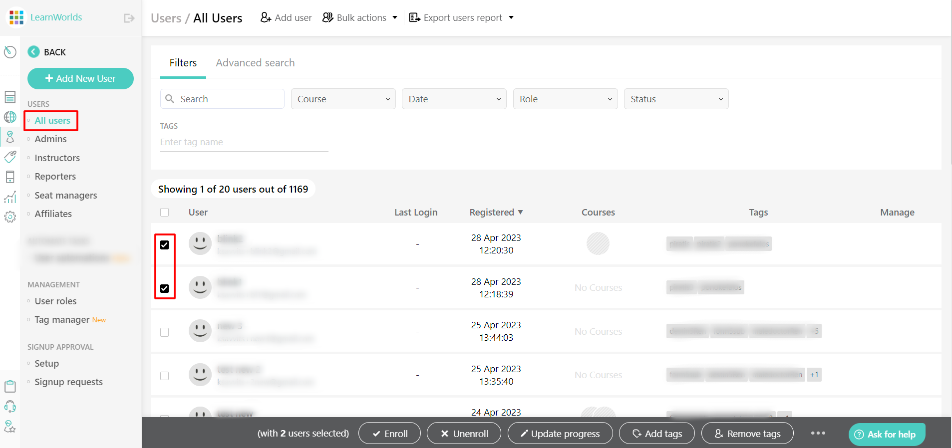 Bạn có thể chọn nhiều người dùng và thực hiện các hành động đối với họ như đăng ký hoặc hủy đăng ký họ khỏi khóa học, tạm dừng hoặc xóa họ, cập nhật tiến trình của họ hoặc thêm/xóa thẻ của họ.
